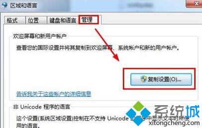 2、在“区域和语言”界面点击【管理】选卡,点击“复制设置”;