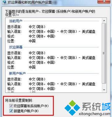 3、在“欢迎屏幕和新的用户账户设置”框中勾选“欢迎屏幕和系统账户”、“新建用户账户”,点击'确定",点击确定,然后重启计算机即可解决。