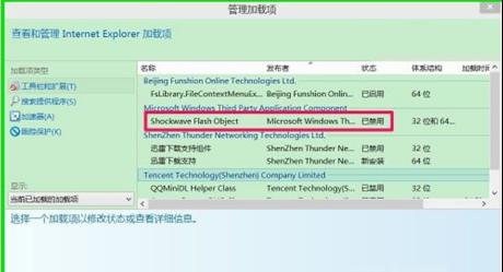 2、在打开的管理加载项,可看到Shockwave Flash Object已禁用;