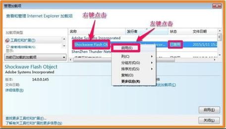 3、在管理加载项窗口,在Shockwave Flash Object右键选择启用。点击“关闭”退出管理加载项即可。