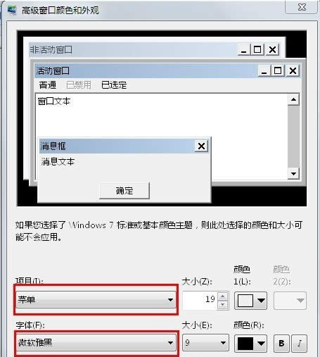 在“项目”的下拉列表中,可以看到所有可以修改的项目,如“菜单”和“工具提示”等带有文字的项目,就可以对字体、大小以及颜色进行任意的修改,而这个地方没有列出的项目,其字体是不能修改的。