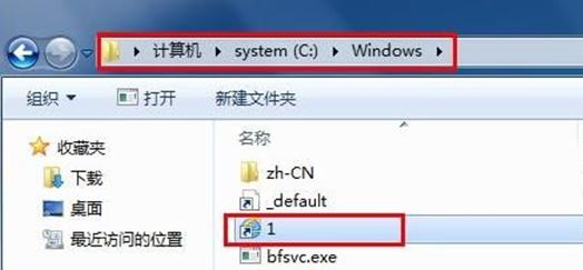 在Win7资源管理器地址栏中输入“%windir%”,打开Windows文件夹,将刚才桌面上已改名的快捷方式剪切并粘贴到该文件夹中。