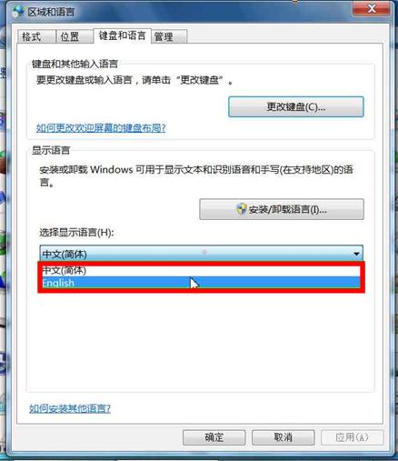 6、然后在键盘和语言选项卡下,找到选择显示语言,这里切换成已安装的语言即可。