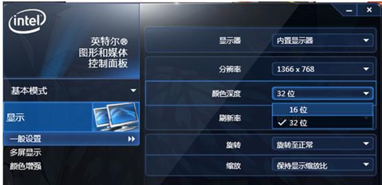 2. 在一般设置里 把颜色深度由32位 改到16位