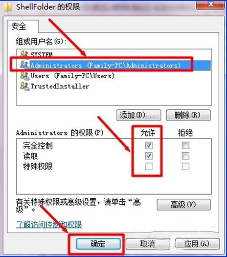 4、ShellFolder权限设置中,选择Administrators账户,将权限选择为全部允许,最后确认。