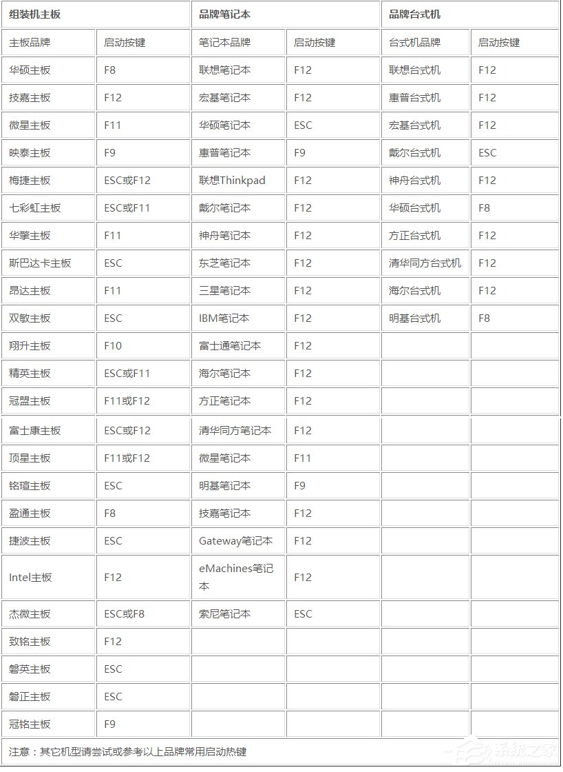 6、按Ctrl+alt+delete组合键重启系统,按F2或F12或DEL进入BIOS设置(不同品牌的电脑按键可能不同,可参照下图)。