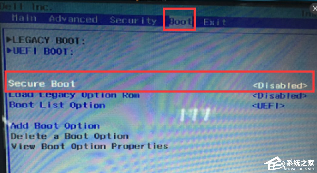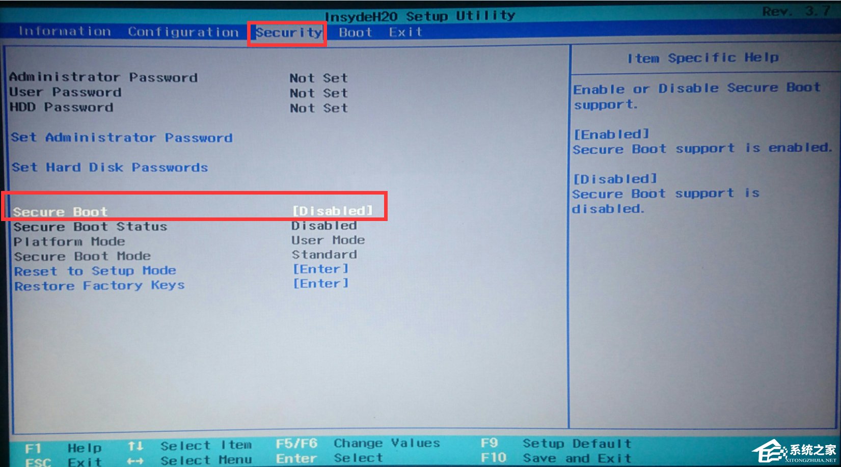 7、 在BIOS设置的(BOOT项或Security项)中找到Secure Boot,将其设置为Disabled(关闭),如果在BOOT或Security中都没找到,可以在其他项中找找。