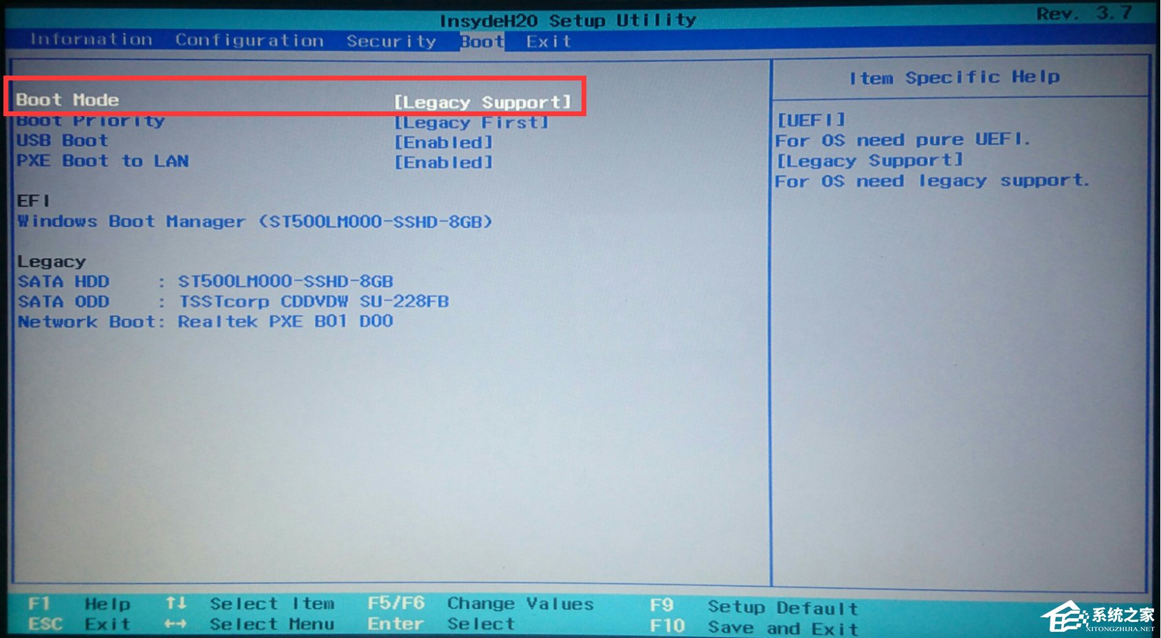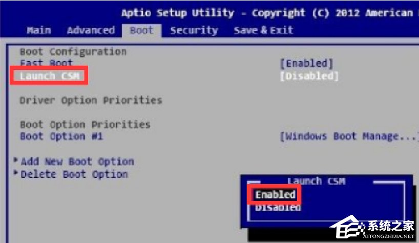 8、在BIOS中的BOOT项找到(Launch CSM或BOOT Mode),将其设置为(Enabled(开启)或Legacy Support)。