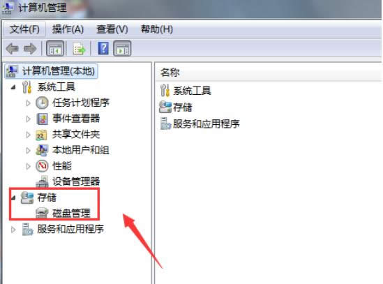 2.在计算机管理界面的左侧点击存储,接着选择磁盘管理。