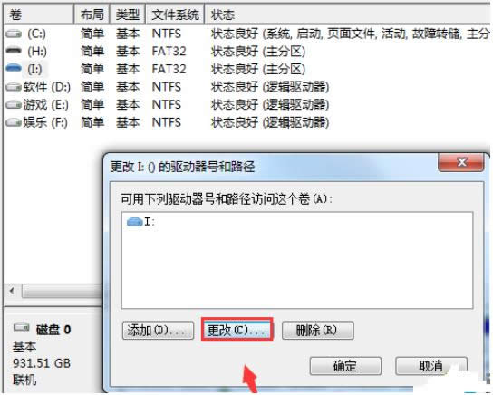 3.磁盘列表中找到sd卡所在的盘符(小编这里是I盘),接着鼠标右键选择“更改驱动器号和路径”,点击更改。