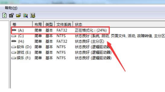 5.点击重新分配好磁盘盘符的u盘,击A可移动磁盘,选择“格式化”,点击确定,就可以格式化了。