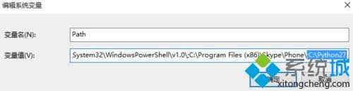 5、在“编辑系统变量”中,变量值的最后添加“;”,并将Python所在的路径添加在分号后边。默认路径的添加值如下:;C:\Python27