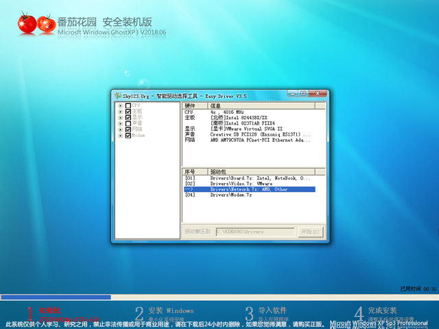 * 安装过程会运行自主开发的驱动选择工具,此工具可智能判断所有的电脑硬件型号,最大限度地避免了因驱动冲突而蓝屏的现象。