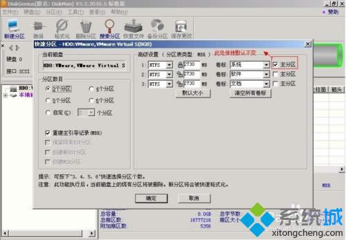 6、选择所需要分区的数目或手动选择硬盘分区数目,并“重建引导记录”保持不变;