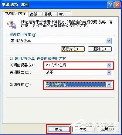 3、打开电源选项窗口,选择关闭监控器与系统待机时间,再按确定即可(这个时间设置,是当您的电脑在这个时间内一直处于无运行状态,那么就会自动待机休息);