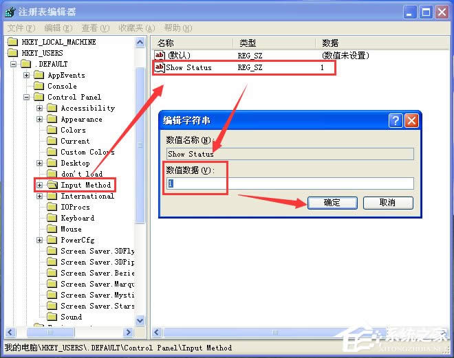 打开注册表编辑器,找到“HKEY_USERS\.DEFAULT\Control Panel\Input Method”分支,将右边窗口中“Show Status”的键值修改成“1”(“1”为显示状态条,“0”为不显示状态条),然后重新启动系统,输入法状态条就出来了。
