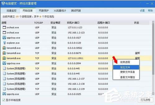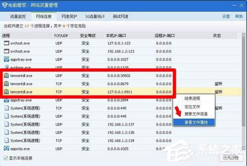 4、电脑管家→网络流量管理→右键点选 Tencentdl.exe →查看文件属性。