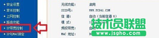 2、如上图,输入完路由器登录用户名与密码后,我们点击下边的确定即可进入中心了,如果您的路由器支持限速功能,那么我们在左侧会看到有一个“IP宽带控制”,如下图: