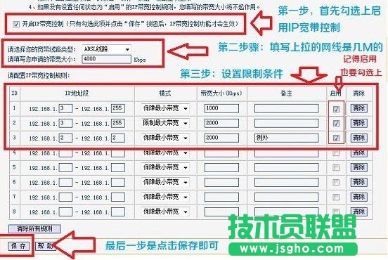 大家设置路由器限速一定要注意以上四个步骤,首先是要第一步,要勾选上“开启IP宽带控制”,然后是第二步,选择自己家的宽带情况,上面演示的是笔者家拉的4M网络。然后就是下边的设置本地IP地址限制网络情况,上图演示的是笔者打算将自己电脑IP地址设计为192.168.1.2,网络分配情况是最低2M,最高也不超过2M,给予其他用户,192.168.1.3-192.168.1.255用户设置限制最低保障1M,最低不高于2M。