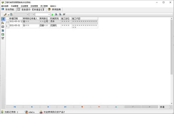 1、机械管理(申请登记、 审批登记、派工登记、施工登记、回单登记、业务明细、全部业务信息、按使用单位统计、按供货单位统计);