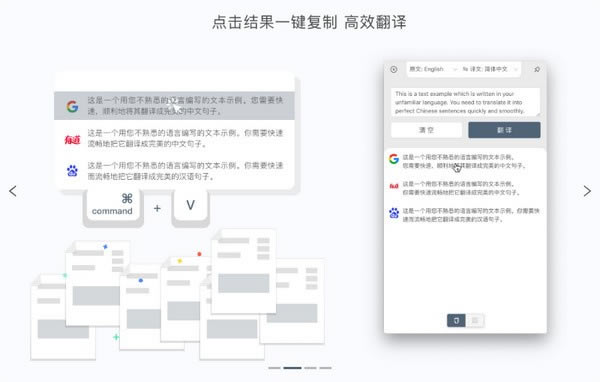 的确,从技术开发上来说,这款产品并没有特别大的难度。但是作为一名设计出身的产品经理, *拿得出手的便是设计与产品体验了。在多源翻译的基础上,我又进行了一些提升效率的设计。比如快捷键翻译、一键复制、智能翻译等等。在这款小小的翻译工具的身上,我倾注了大量的心思来思考如何提升易用度,提高翻译的流畅程度,提高翻译者的工作效率。