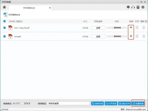 3、添加完成需要转换的PDF文件到转换列表后,可以做一些简单的设置操作。如:按照自身需要选择转换格式类型(DOC或DOCX),以及选择转换后的文件保存目录,点击“选择目录”按钮即可选择希望将转换出来的word文档保存到指定的目录下。