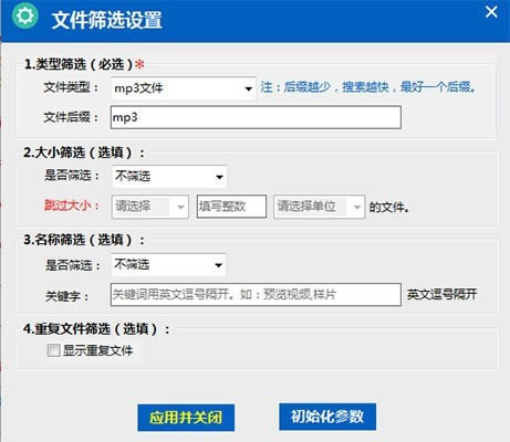 (2)不同类型文件筛选:文件类型可以自定义任意类型的文件名后缀,只需用英文逗号隔开就可以。如:mov,mp4
